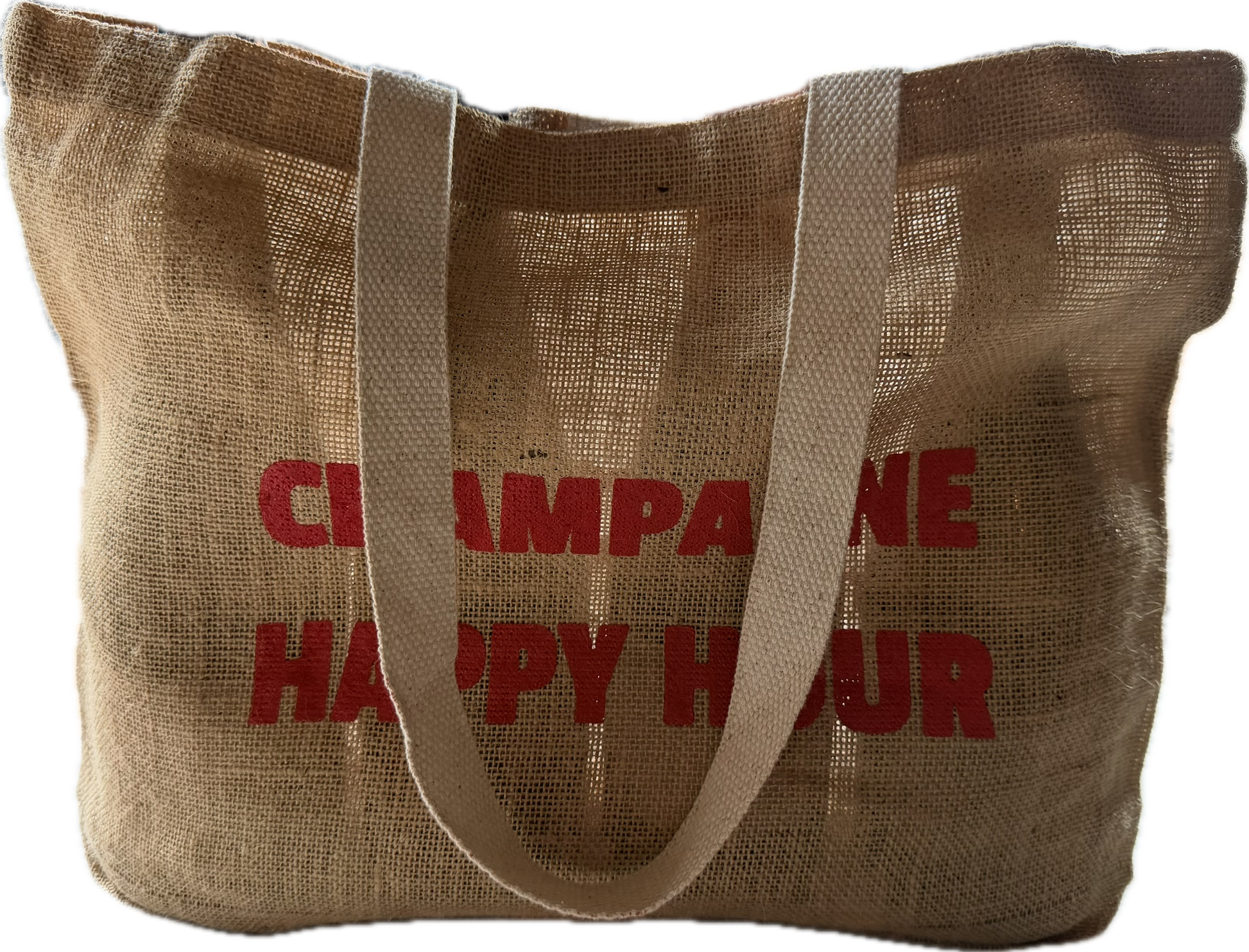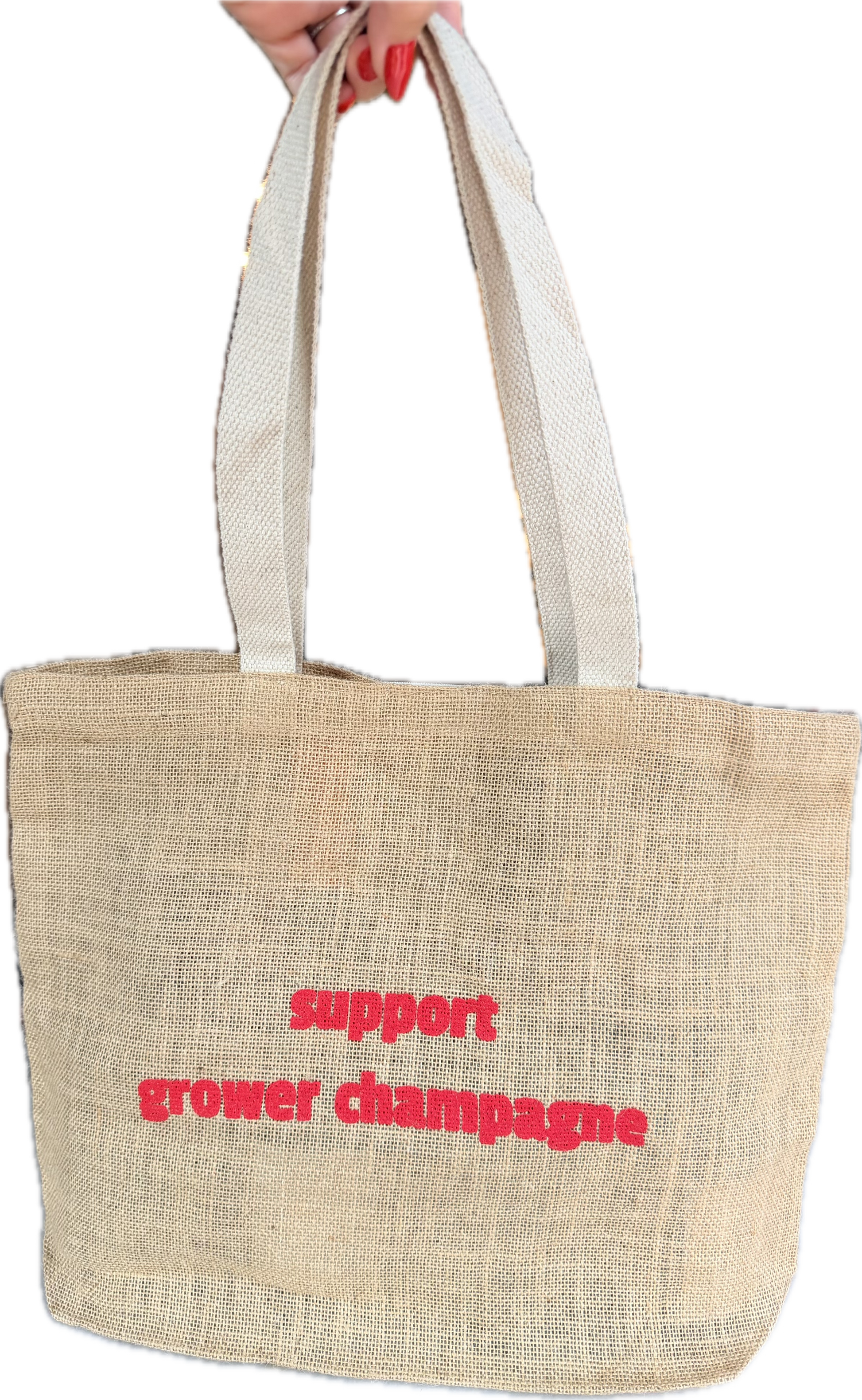 Grower Champagne Market Tote. Natural burlap with cotton handles. Double sided print. Velcro closure. 17”W x 13.5”H perfect for your next champagne happy hour moment with friends!